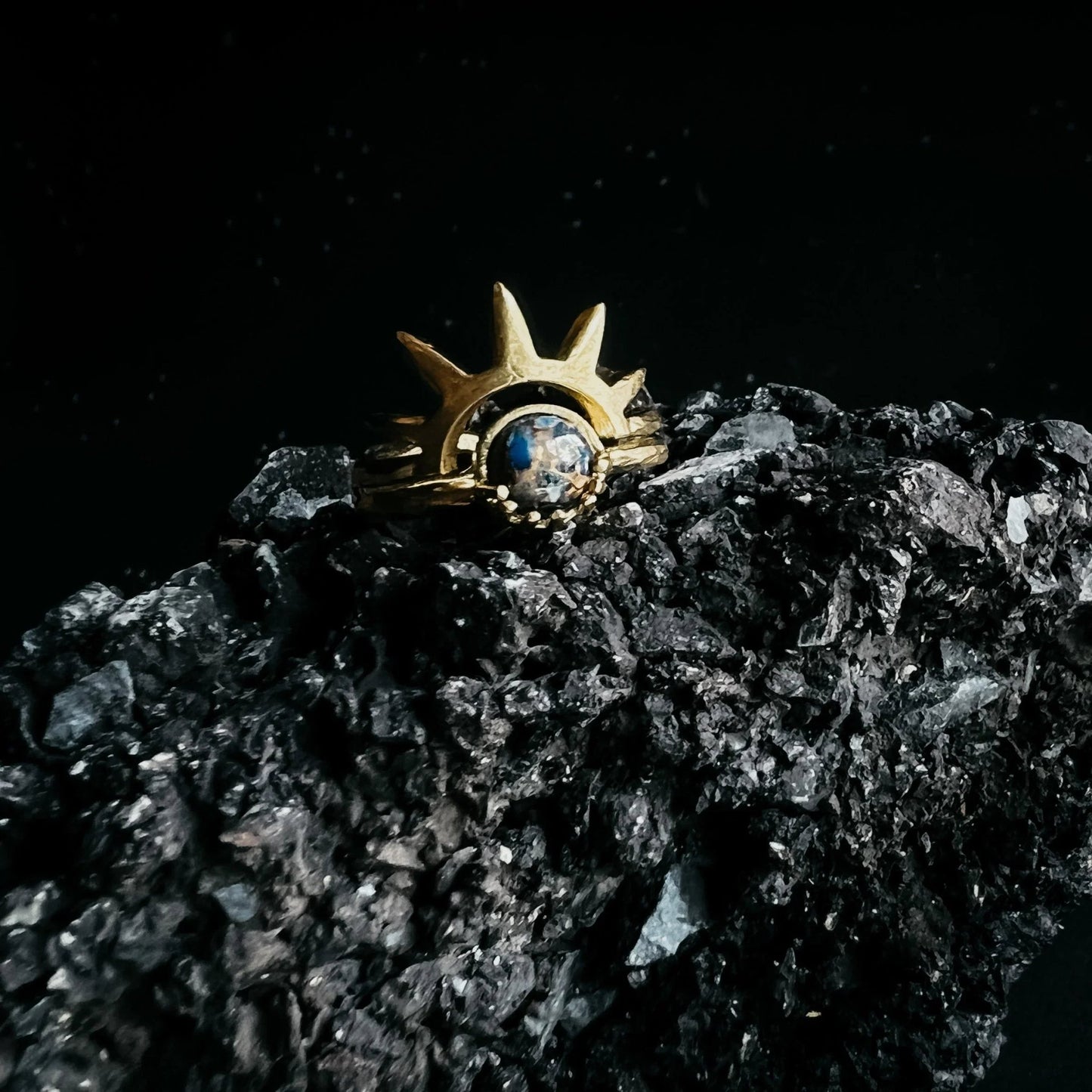 Gorgeous gold tone adjustable ring in a sunburst crown shape, nestled with a piece of veiny copper calcite lapis lazuli, a natural stone of deep blue and gold. A ring to remind you on your self care journey that there it is always darkest before the dawn. A great piece for the dichotomy of solstices as well.