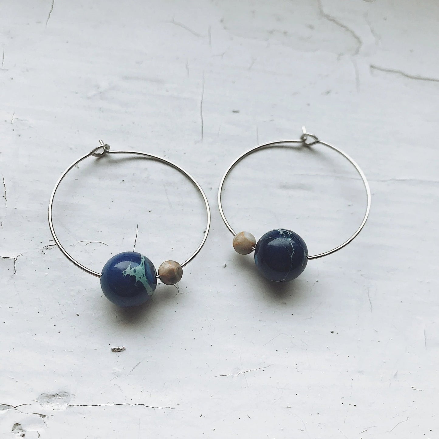 Boho fashion taken to a cosmic level...and at the perfect price point! Simple hoops with beautiful colorful jasper beads that represent the Earth and it's Moon. The perfect earrings for the astronomy lover without being too on-the-nose with your love of the cosmos! Available in silver tone or gold tone.