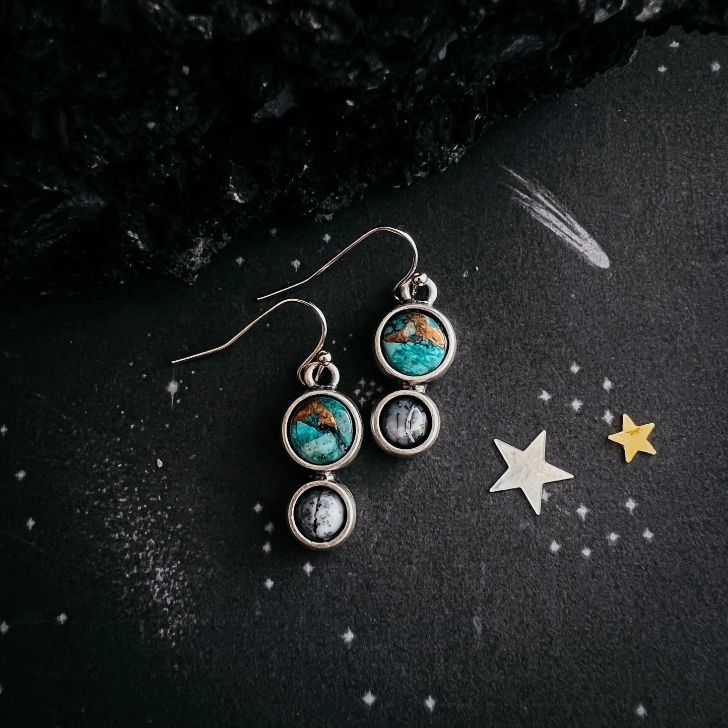 Delight in the beauty of the Earth and Moon with this simple statement pair of earrings. Handcrafted with copper chrysocolla and dendrite stones, this timeless duo embodies celestial charm. Show off your unique style and passion for the stars with this beautiful everyday accessory!