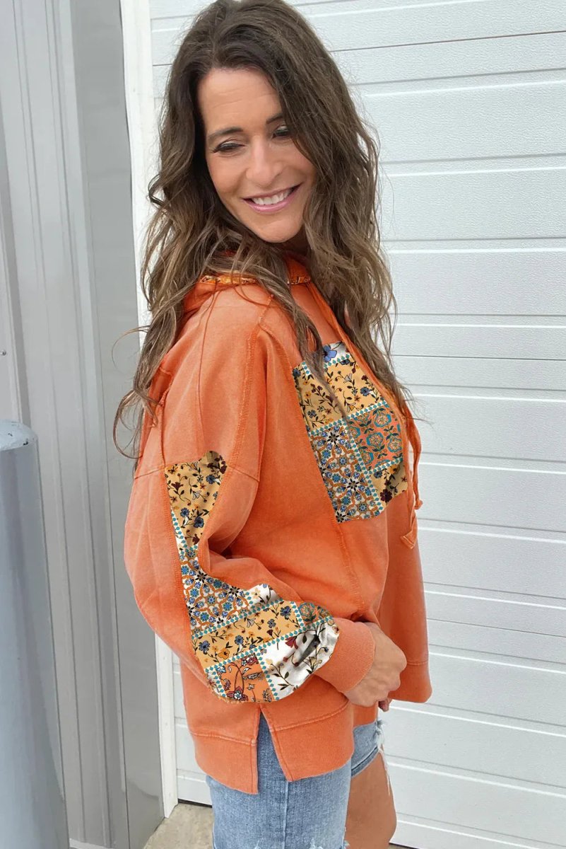Flamingo Mix Floral Patchwork Side Slit Drawstring Hoodie