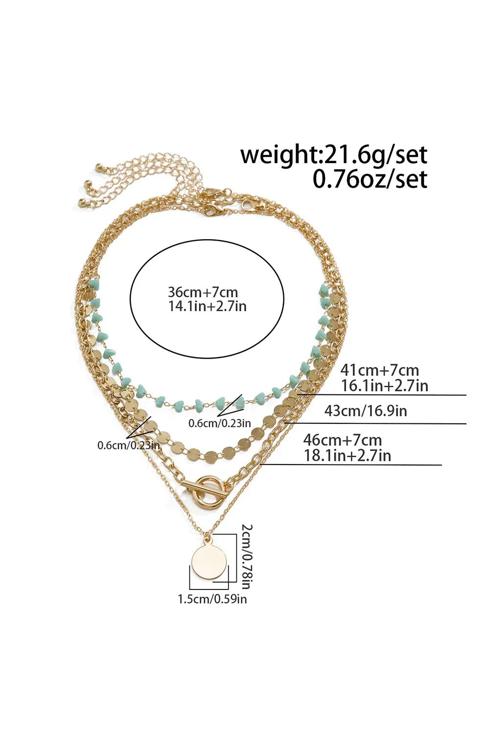- This set features multiple layers of delicate chains adorned with circle pendants, adding a touch of elegance to any outfit.