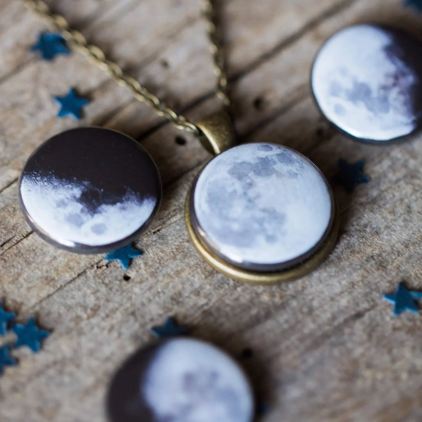 It's like having 5 necklaces in 1! Perfect to change out every day of the work week to fit your mood. This listing is for an interchangeable magnetic antique bronze or silver-tone necklace with 5 phases of the Moon! Uses a very strong magnetic combination so the Moon will not fall out of the necklace. And while you're not wearing them, let them dazzle your fridge!