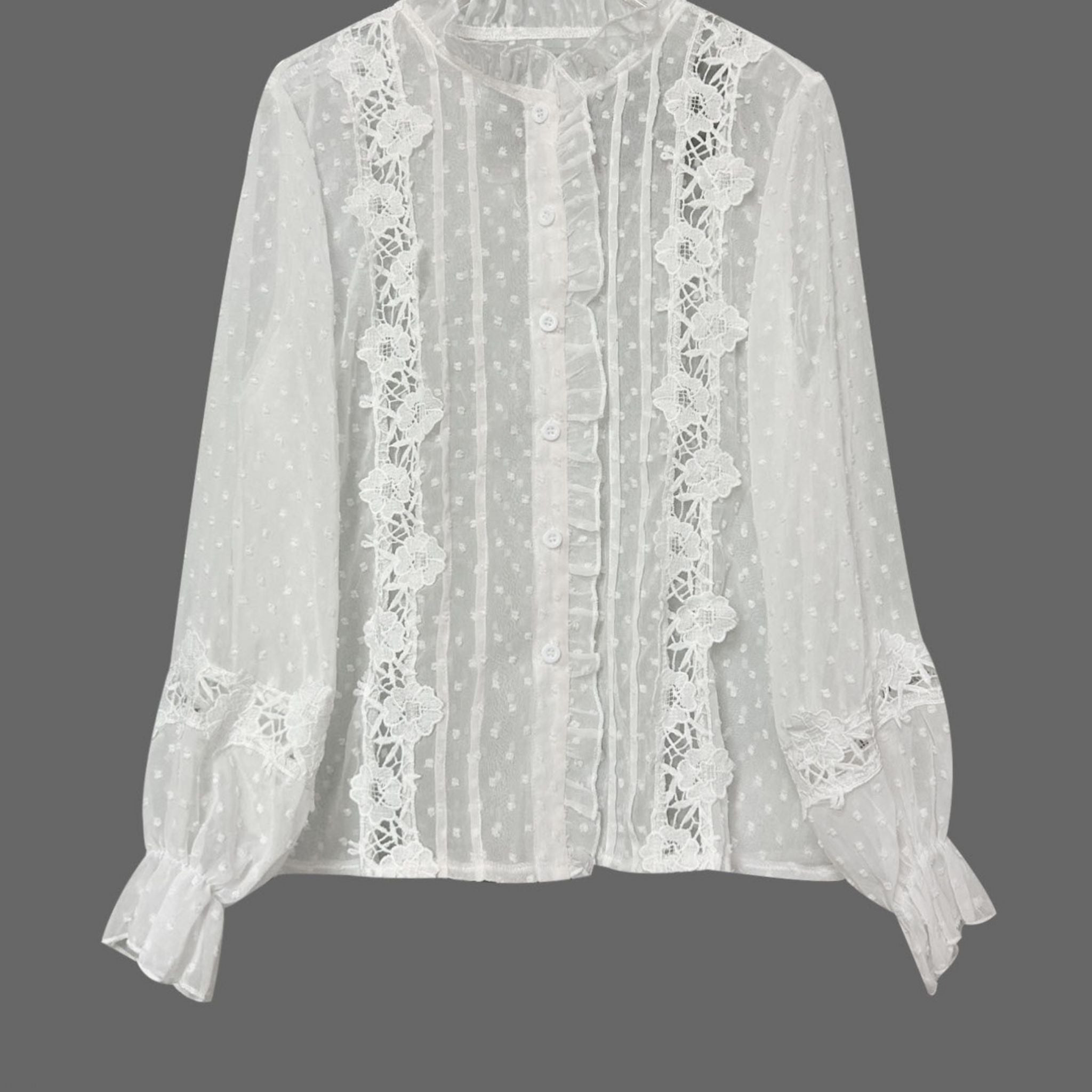 Elevate your everyday style with our charming Lace Trimmed Swiss Dot Shirt. This delicate button-up shirt features a classic silhouette with a touch of feminine flair. The subtle swiss dot pattern and delicate lace trim add a sophisticated, yet casual touch. Perfect for pairing with jeans or dressing up for a smart-casual occasion. Shop this versatile swiss dot shirt now and add effortless elegance to your wardrobe.