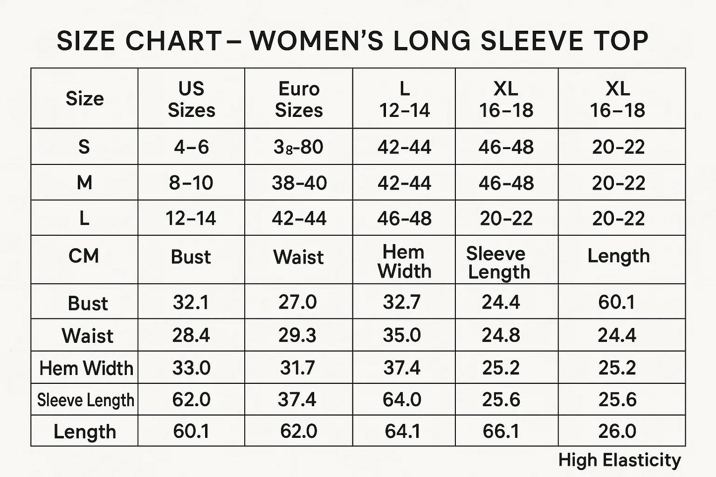 Available in sizes S through XL, this long sleeve top is designed to flatter every body type. The high elasticity fabric ensures a comfortable fit that moves with you throughout your day. The slim fit design creates a flattering silhouette while the stretch fabric accommodates natural movement and provides all-day comfort. Check our detailed size chart below to find your perfect fit.