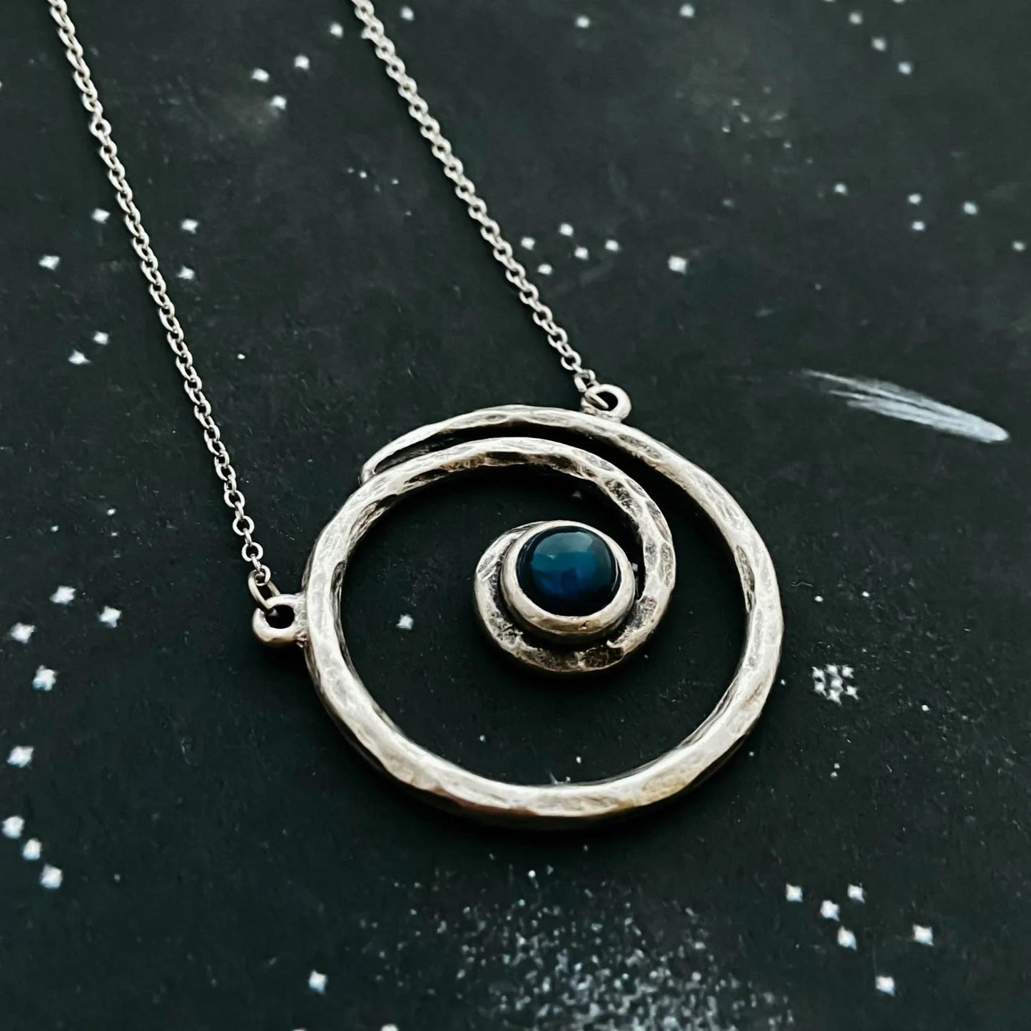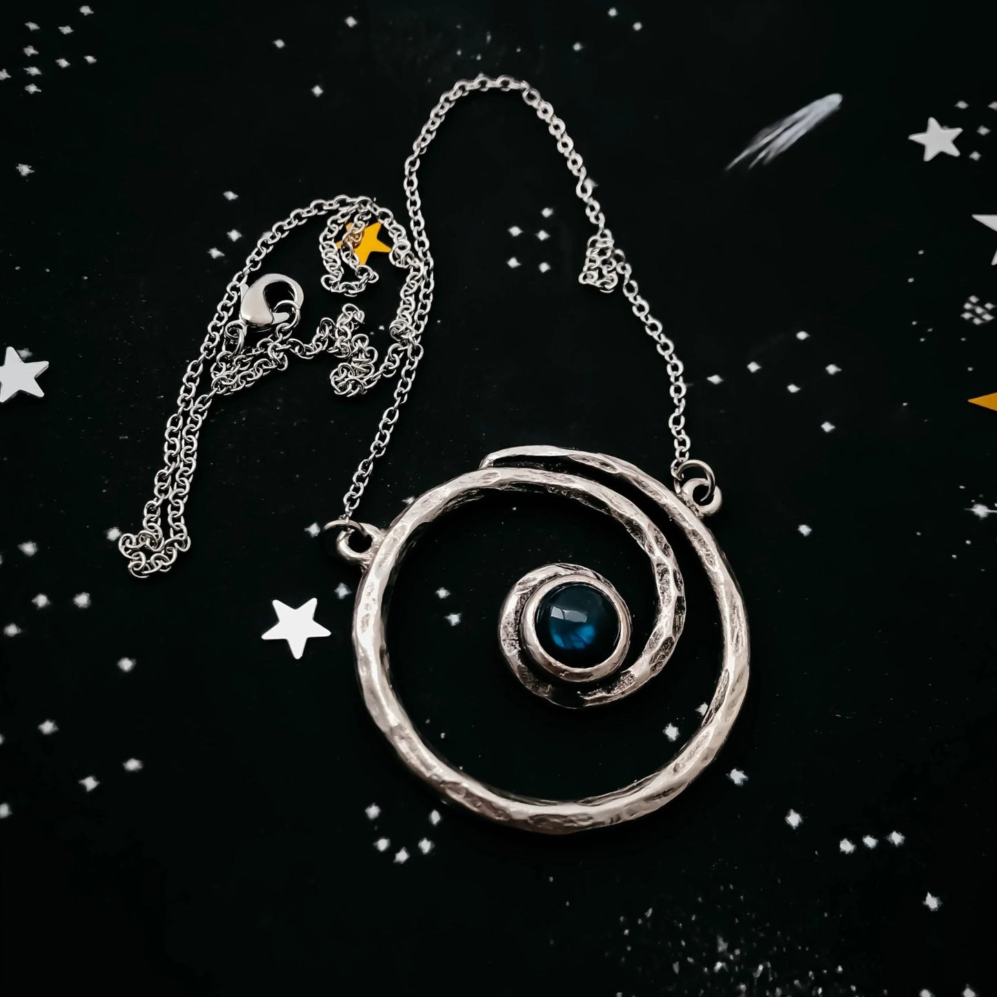This hammered silver-tone spiral necklace set with flashy labradorite pays homage to our home galaxy, the Milky Way. A more bohemian take on our celestial jewelry stylings, this statement pendant is sure to turn heads with every colorful flash of the stone. Celebrate our cosmic home in style!