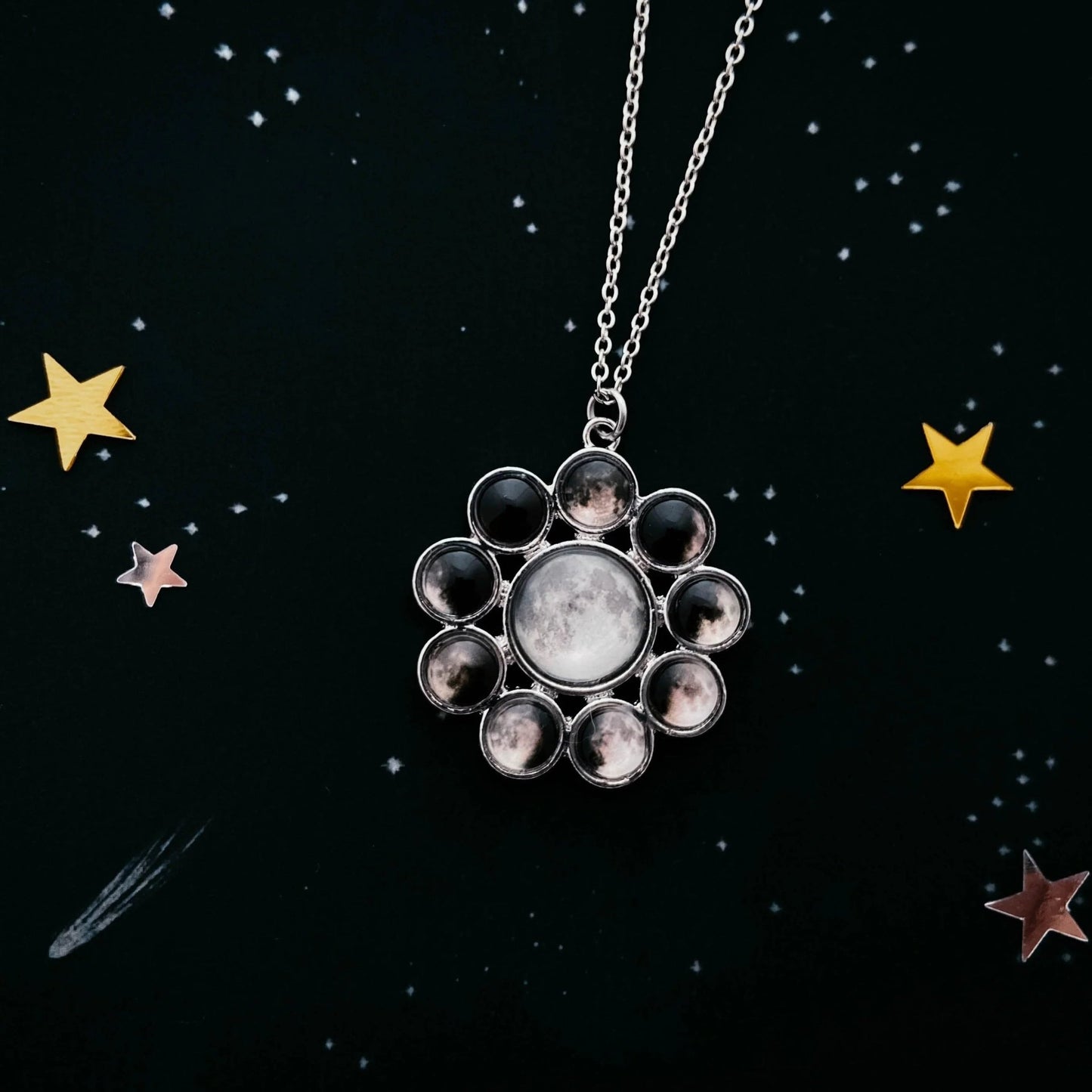 The phase of the moon is in constant flux. Celebrate the entire lunar cycle with this simple and striking halo pendant necklace and earring gift set! Silver tone and halo style, this is set with a full moon in the center surrounded by 9 phases of the moon. A perfect gift for the stargazer or nature lover in your life!