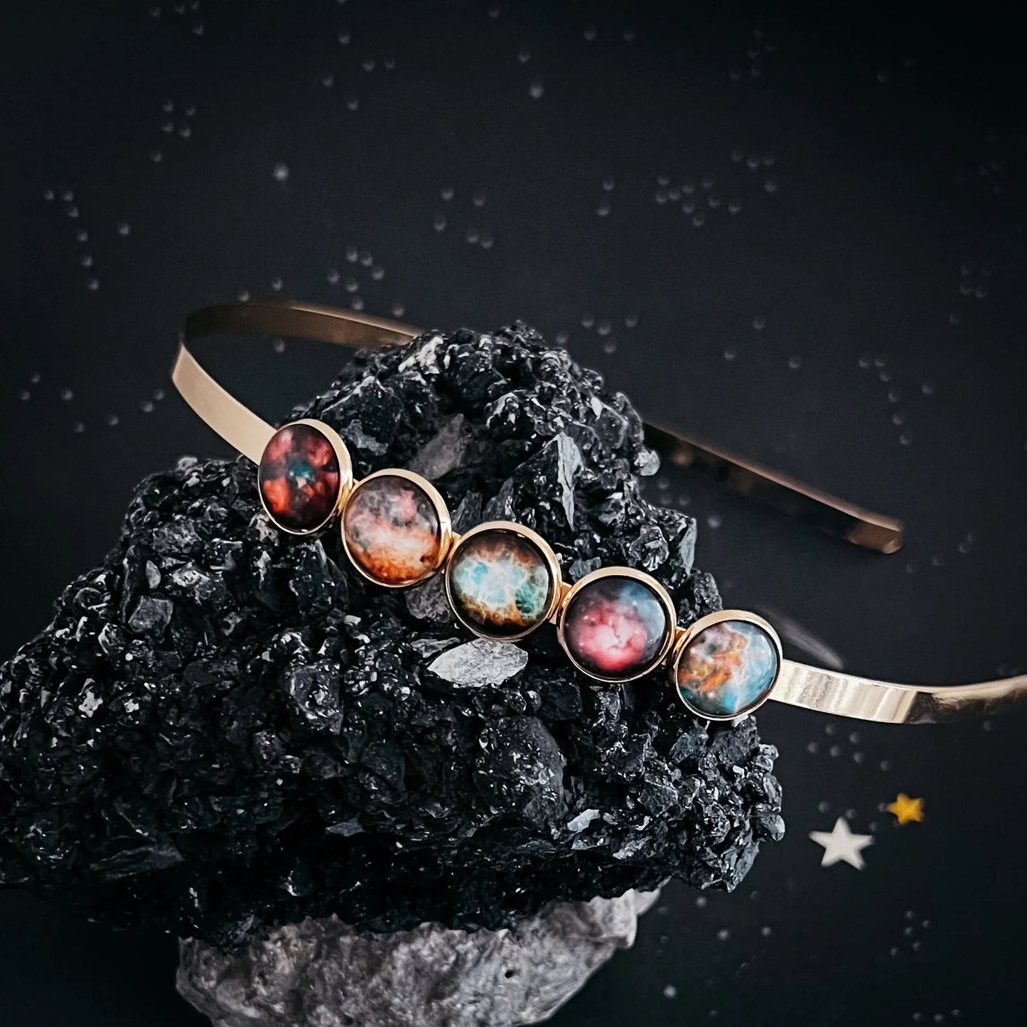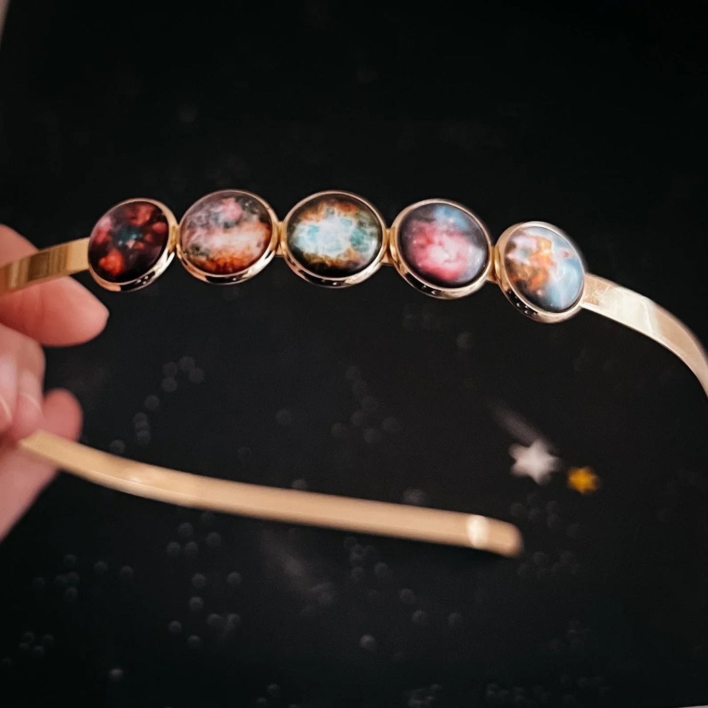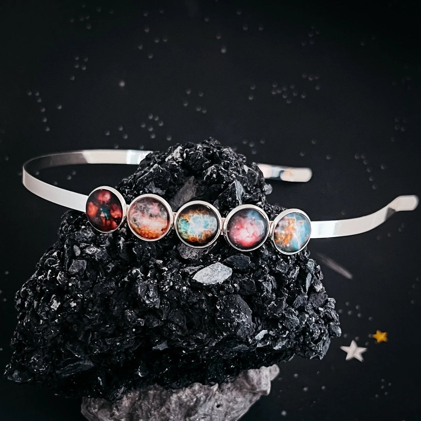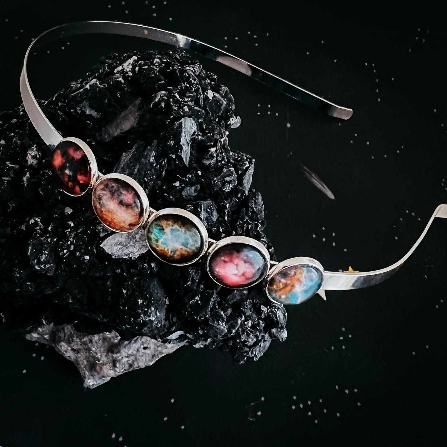 A prideful celestial celebration, this Nebula Rainbow headband is a simple but unique statement piece. Available in your choice of shiny silver or shiny gold tone, this headpiece features 5 nebulae in an order harkening to the rainbow ROYGBIV. The perfect bridal crown for a galaxy wedding, or addition to your daily wardrobe rotation, this makes a wonderful gift for any colorful stargazer.