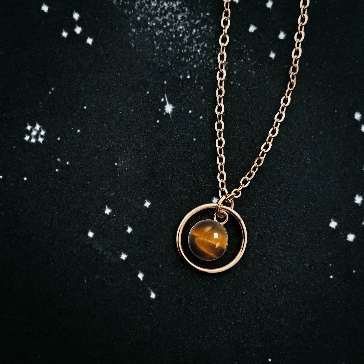 This delicate pendant is positively darling. This petite 14k gold necklace is designed as a love letter to the ringed gas giant we all love and admire, Saturn. Using natural tiger eye stones that lend themselves to the color and texture of this beloved planet, this dainty pendant is subtle enough for the closeted space nerd, yet obvious enough to those who know what to look for! A perfect daily staple to your jewelry collection.