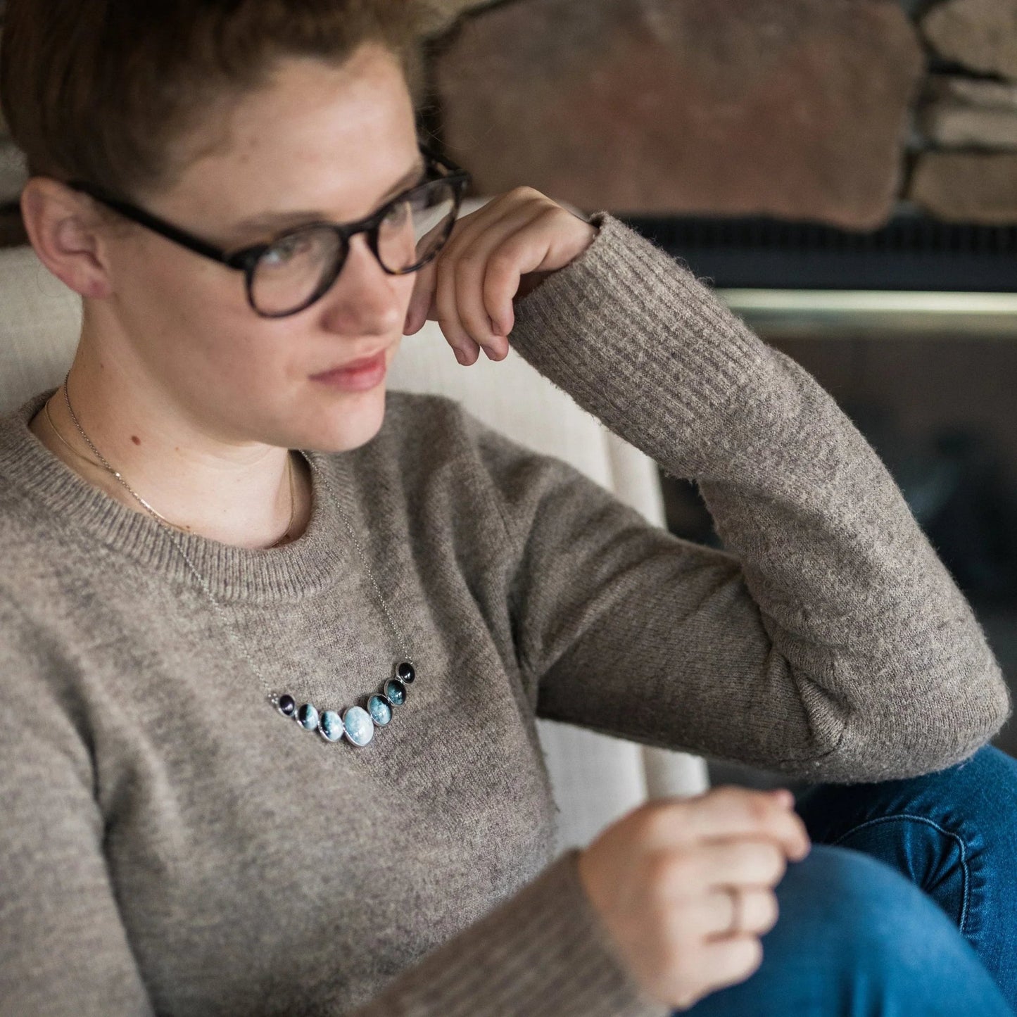 A beautiful collar necklace of moon phases with varying faces of the lunar cycle. What more could you want than the beautiful moon hanging around your neck? In these delicately shaped silver bezels, you can do just that. A celestial celebration, this Moon Phase necklace is a simple but unique statement piece. With our design, you get 7 phases of our Moon on one necklace. A wonderful gift for stargazers, nature lovers, moon watchers, science enthusiasts, astronomy fanatics, and students of the Universe itself.