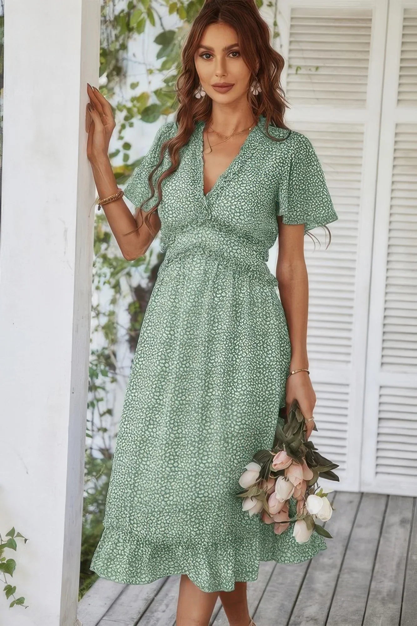 The Deep V Neck Floral Boho Ruffle Short Sleeve Dress is a romantic and carefree piece perfect for brightening up any day. Made from 100% polyester, this dress offers lightweight comfort with a touch of bohemian charm. The deep V-neckline and empire waist create a flattering, feminine silhouette, while the short ruffle sleeves and delicate floral print bring a playful elegance. Flowing to a midi length, this dress moves beautifully with you, making it an ideal choice for everything from vacation strolls to casual weekend plans.