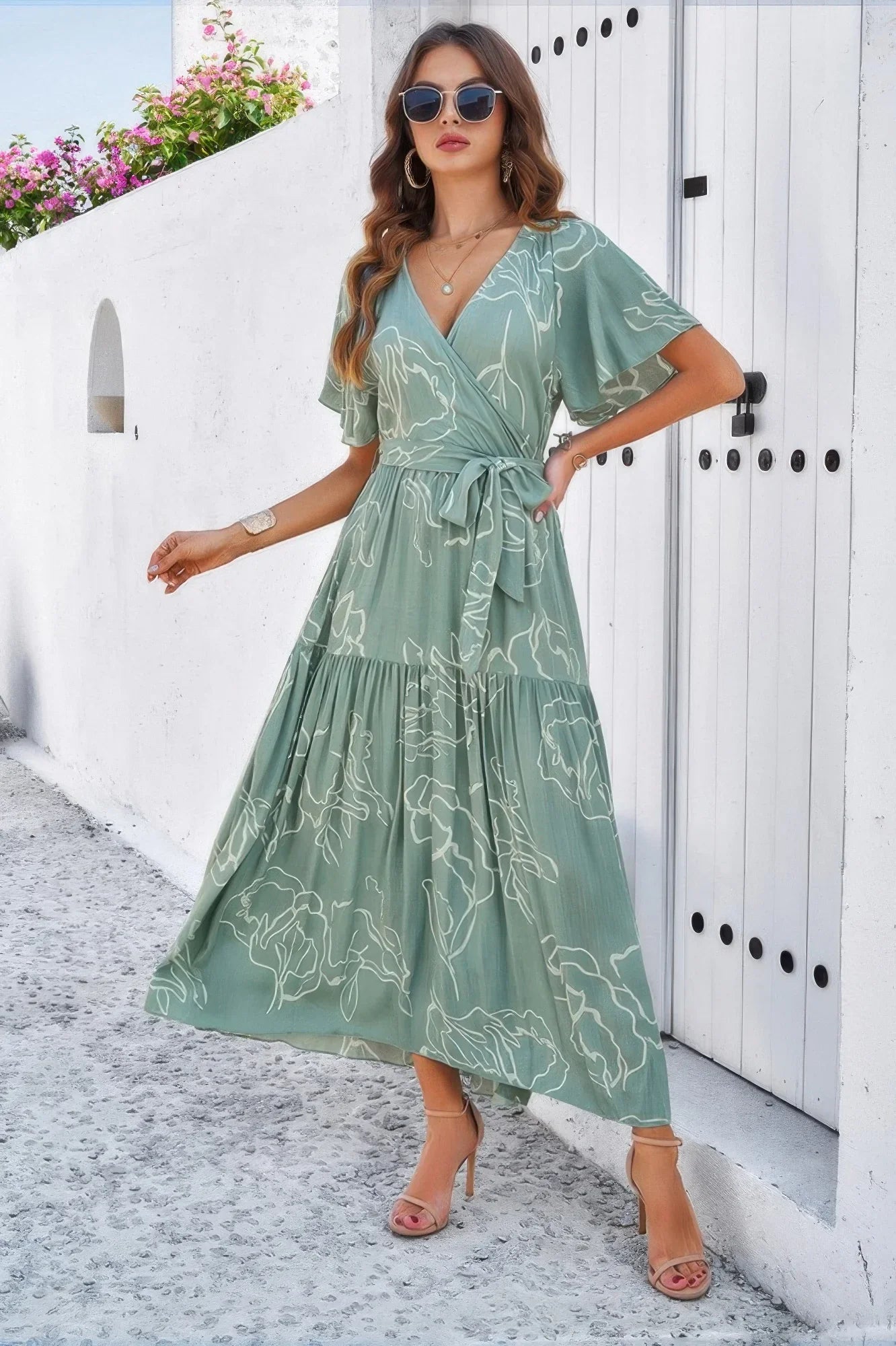This allover print V-neck fit belt A-line long dress blends effortless elegance with laid-back style, making it a must-have for any wardrobe. Crafted from 100% viscose, it’s lightweight and breathable, perfect for warm-weather days and tropical getaways. The flattering V-neckline pairs beautifully with the belted waist to create a feminine silhouette, while the A-line cut and flowy skirt ensure easy movement. With its playful allover print, this dress is ideal for daily outings, vacations, and any moment that calls for a touch of carefree style.
