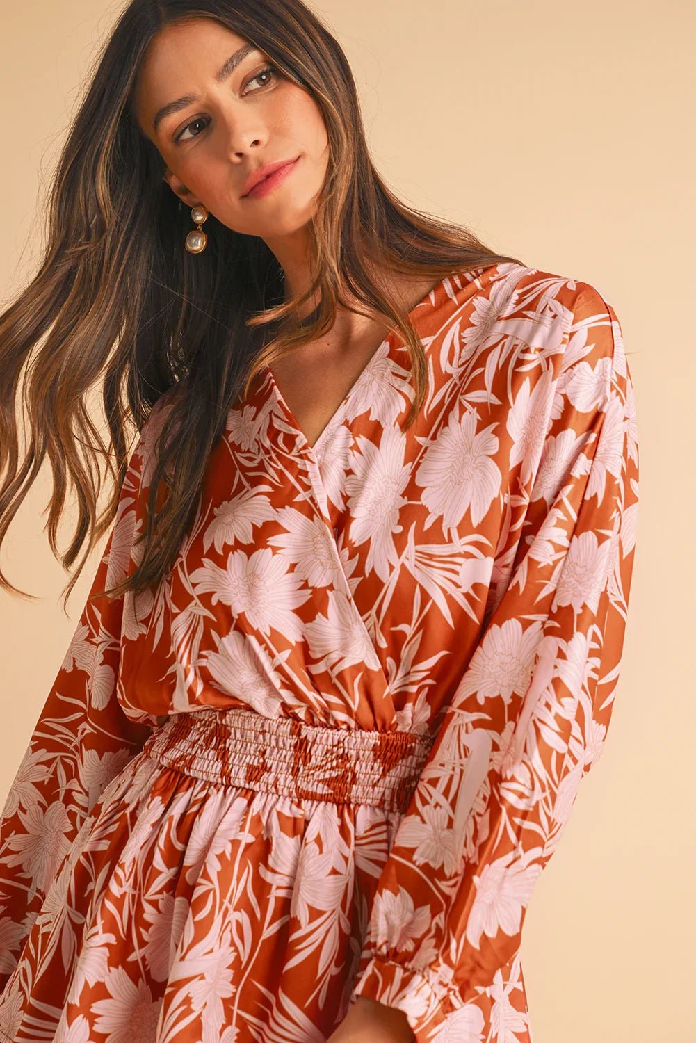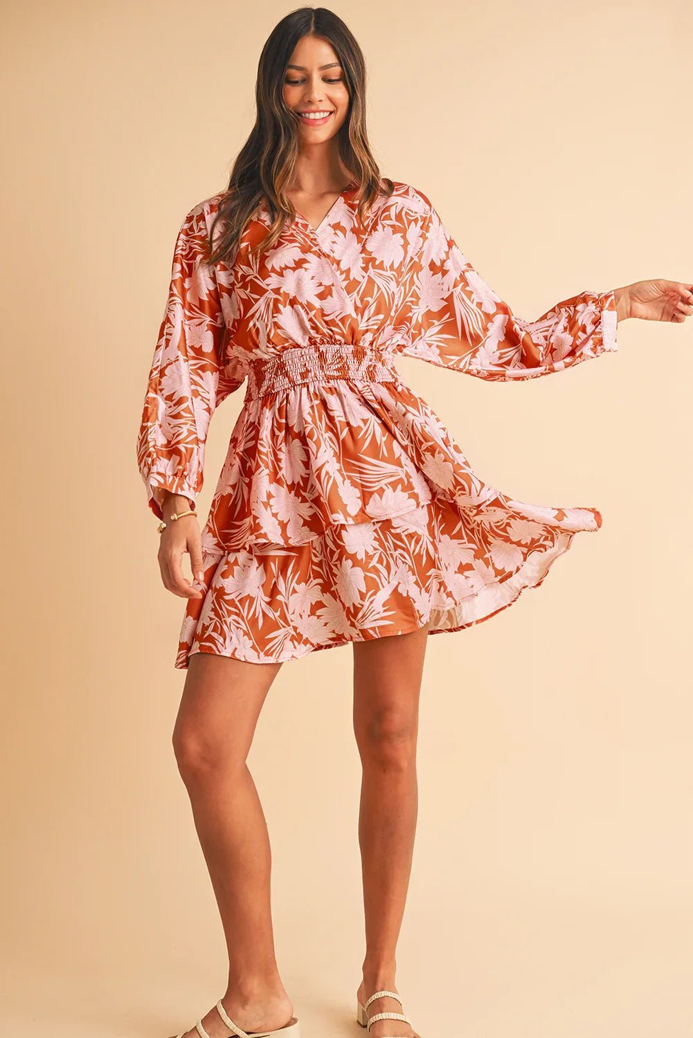 Brown Floral Puff Sleeve Shirred Waist Layered Dress