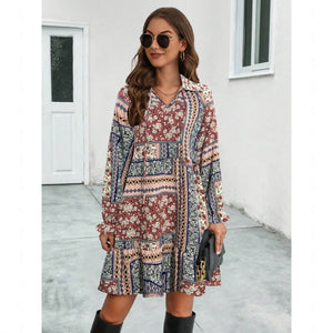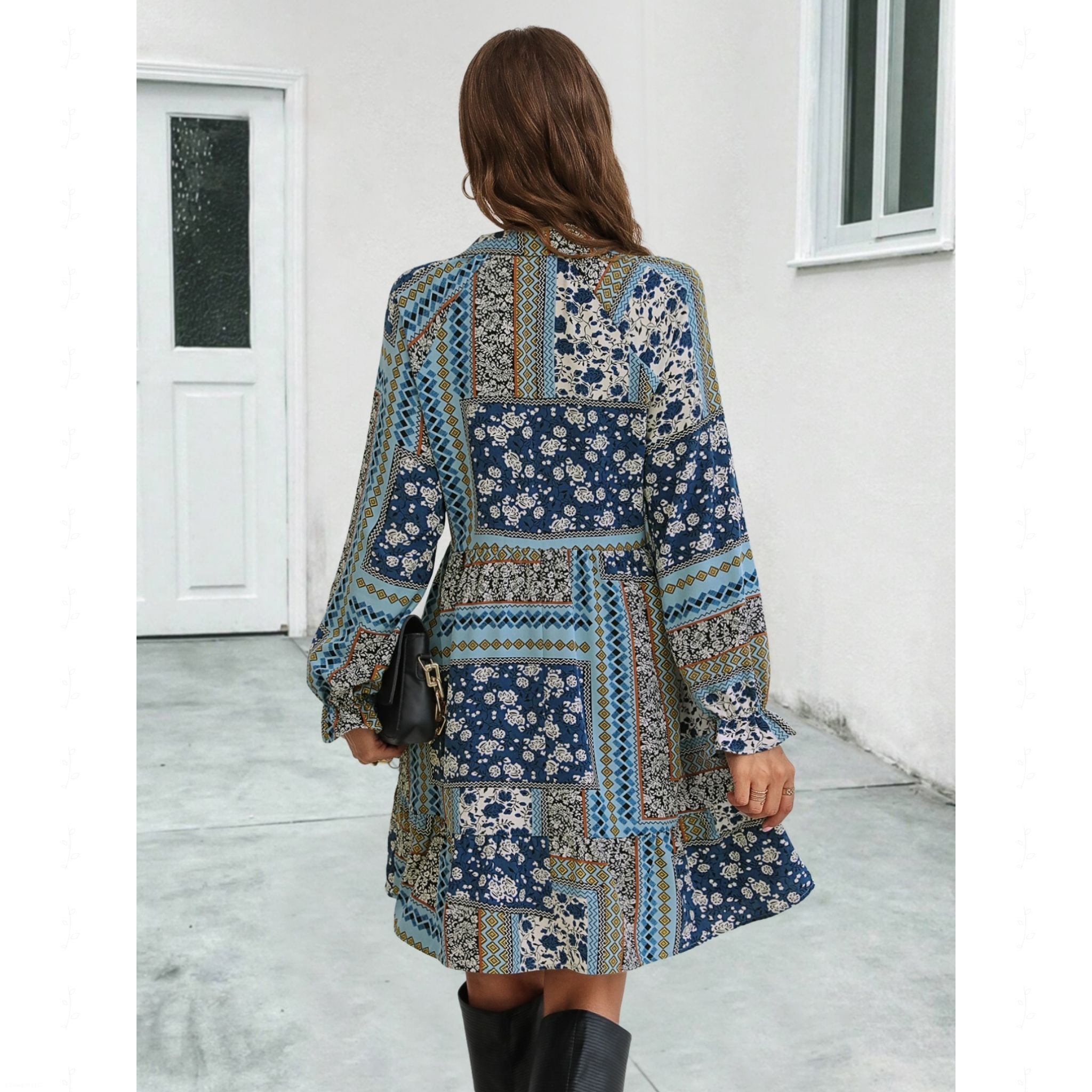 This Boho Floral Print Long Sleeve Mini Dress is designed for comfort and style. The mixed print adds visual interest. The mini length is perfect for showing off your legs. The dress is crafted from a lightweight blend of polyester and spandex. This ensures a comfortable fit with minimal stretch.