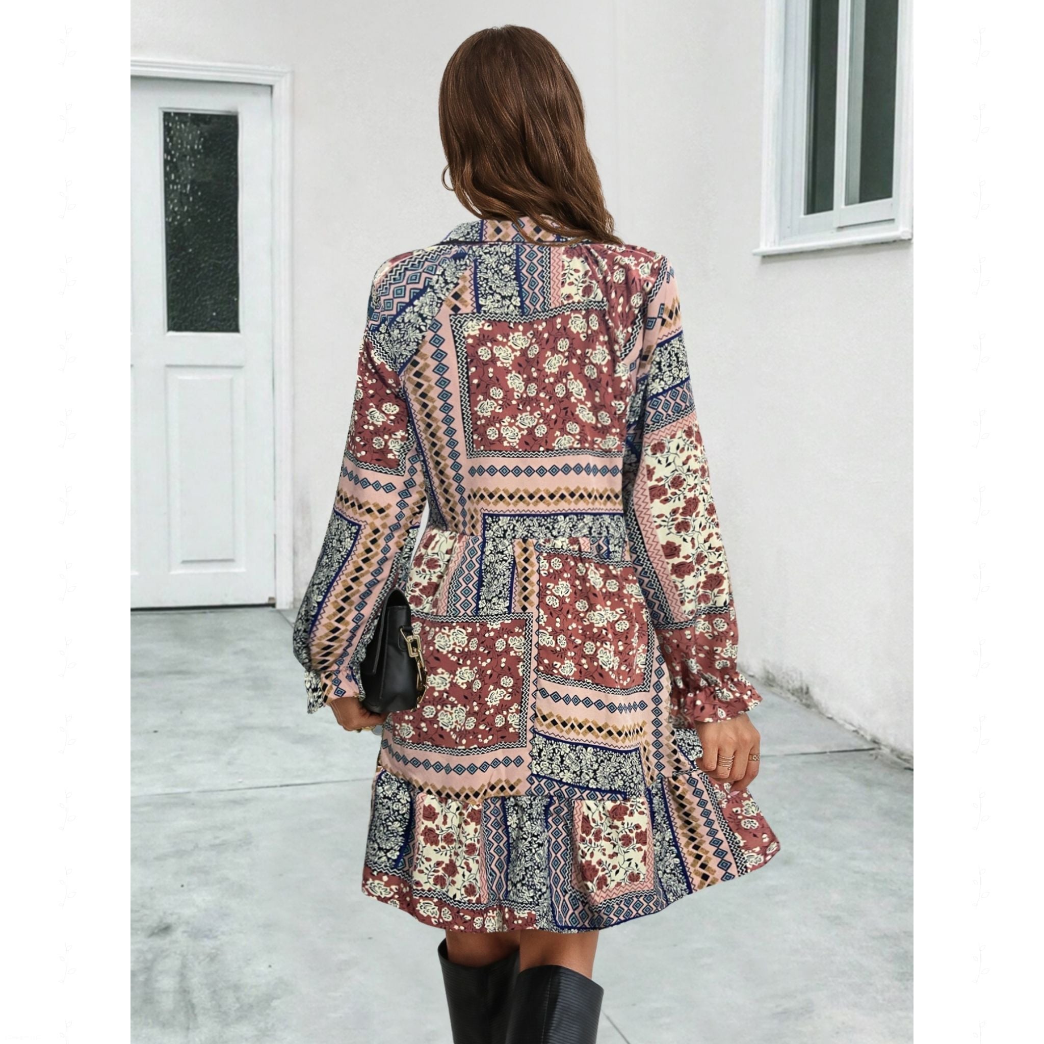 This chic mini dress combines comfort and style. The long sleeves and ruffled details add a feminine touch. The eye-catching floral print creates a unique, bohemian vibe. It's perfect for weekend getaways or casual evenings out. Pair it with your favorite boots for a complete look.