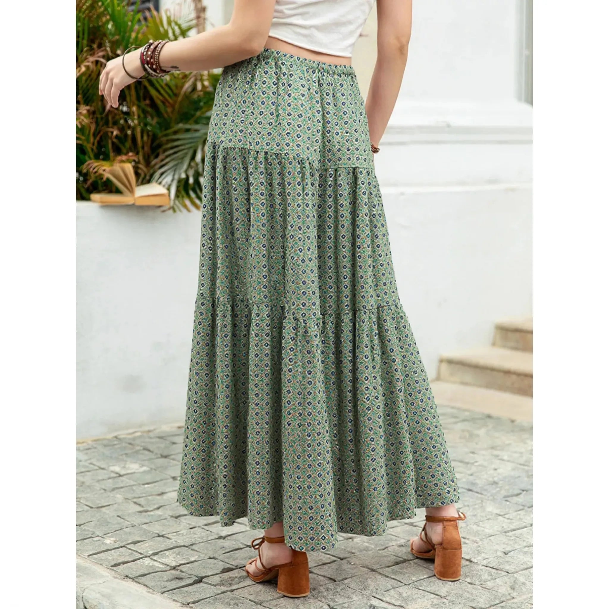 Picture yourself strolling through a sun-drenched farmers market, the gentle breeze catching the flowing tiers of your skirt as you move. This boho print tiered maxi skirt is designed for those moments when you want to feel beautiful, free, and authentically yourself.