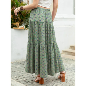 Boho Print Tiered Maxi Skirt - Matcha Green Long Skirt with Drawstring