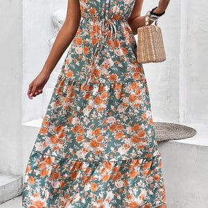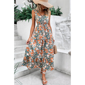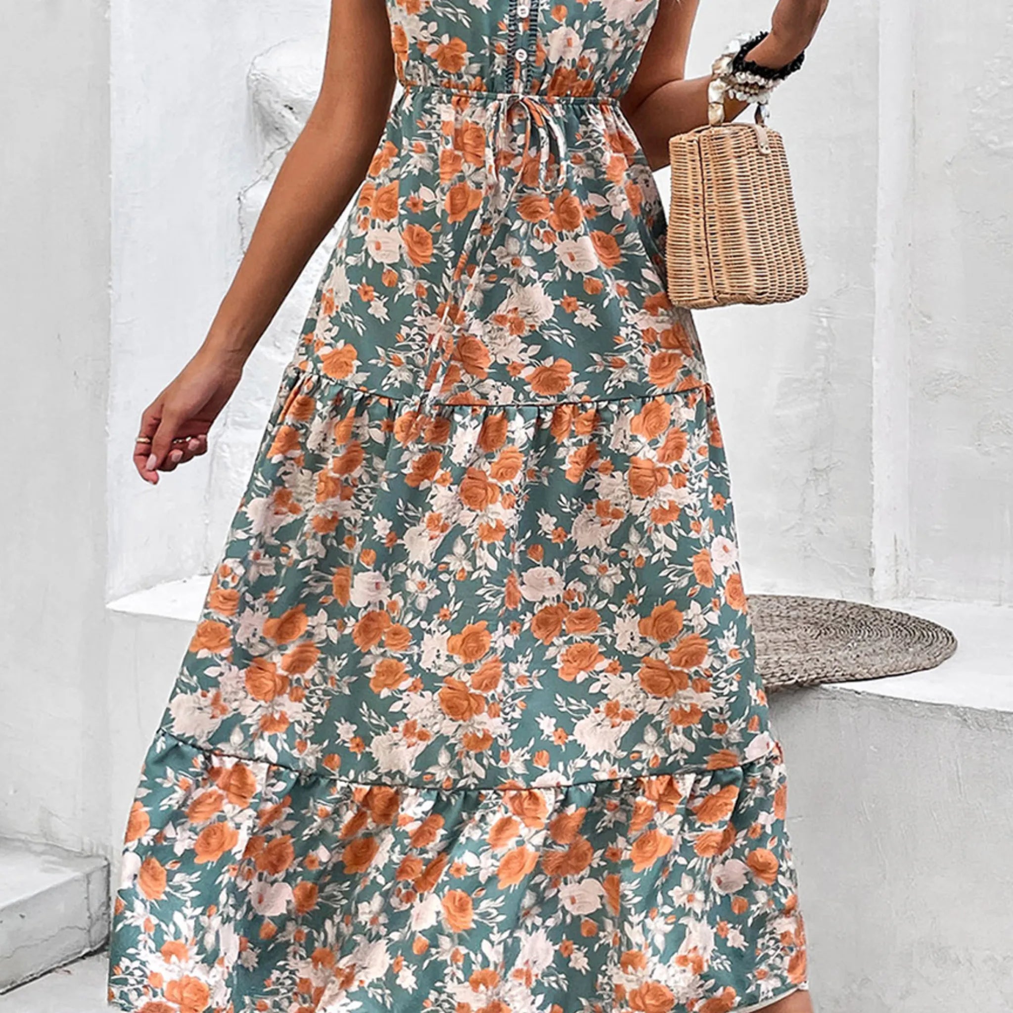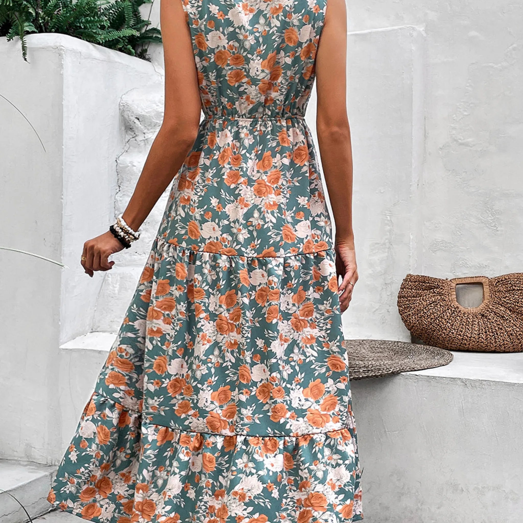 Capture the essence of summer with this beautiful green floral midi dress. The boho-chic design perfectly combines freshness and style for warm-weather wear. This sleeveless dress offers comfort without sacrificing fashion, making it an ideal addition to your summer wardrobe. Whether you are heading on a vacation or simply want a laid-back look, this dress fits every mood perfectly.