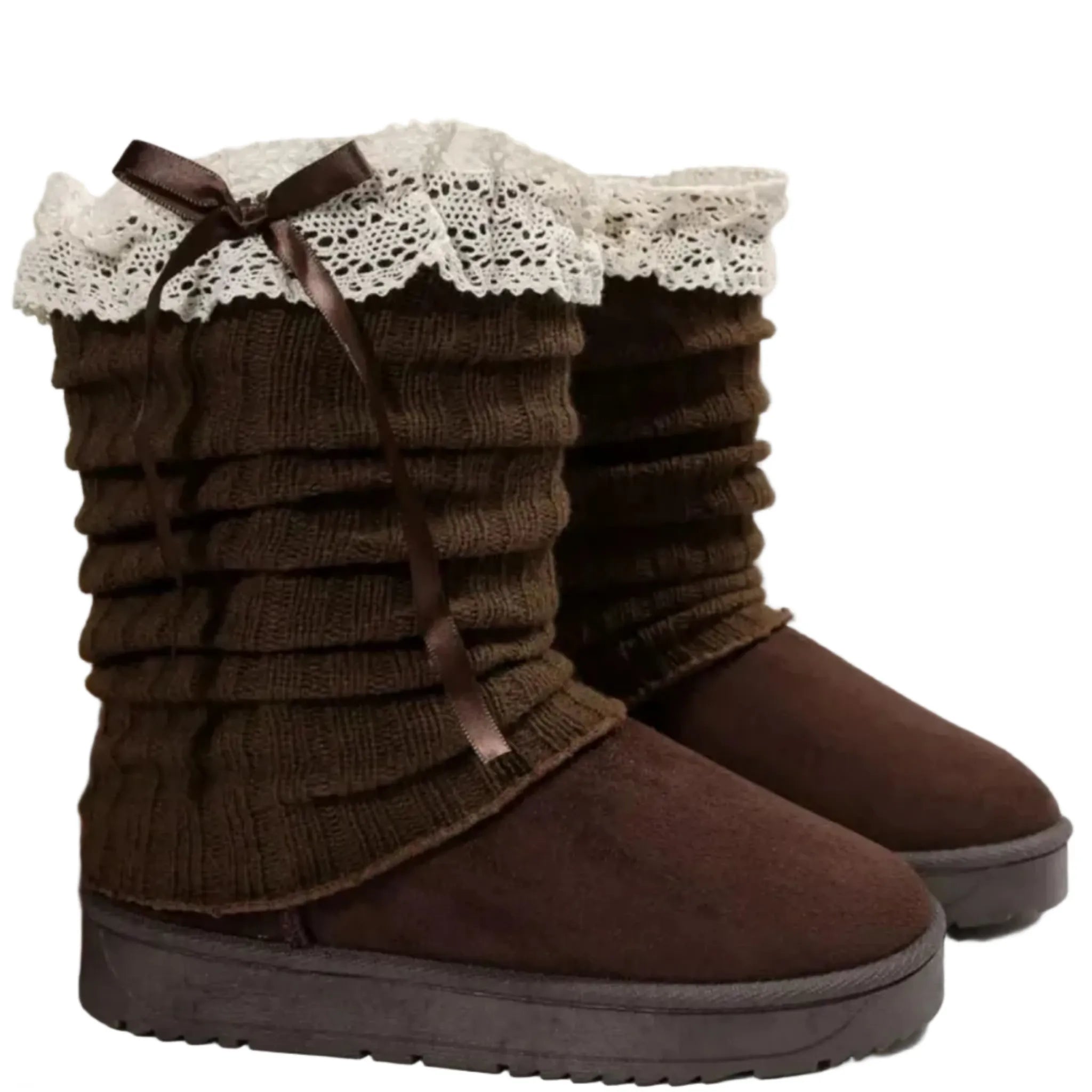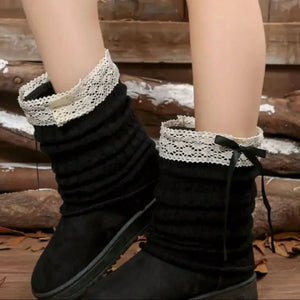 Round Toe Platform Boots with Lace Trim Bow Detail